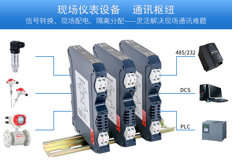 將PT100等熱電阻跟熱電偶信號轉(zhuǎn)換成各種電流、電壓等標準模擬量信號,可以與PC機、PLC、DCS等實現(xiàn)工控監(jiān)測連接。