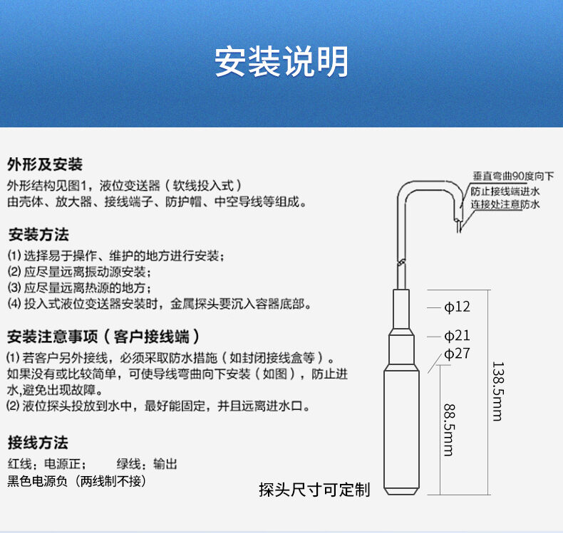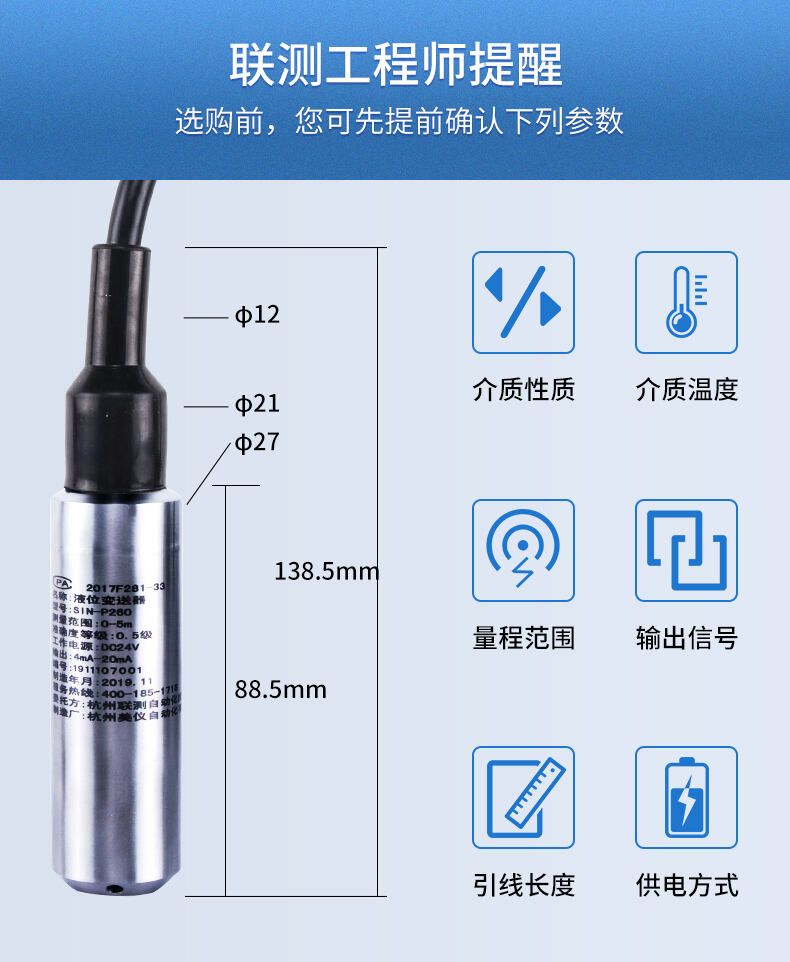 SIN-P260/P2600投入式液位變送器由高性能擴(kuò)散硅壓阻式壓力傳感器作為測量元件,把與液位深度成正比的液體靜壓力準(zhǔn)確測量出來,并經(jīng)過信號調(diào)理電路轉(zhuǎn)換成標(biāo)準(zhǔn)(電流或電壓)信號輸出,建立起輸出信號與液體深度的線性對應(yīng)關(guān)系,實(shí)現(xiàn)對液體深度的測量。