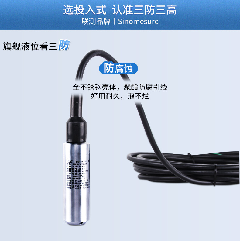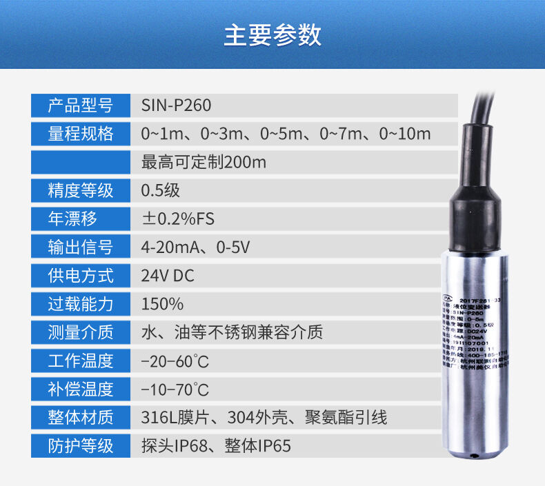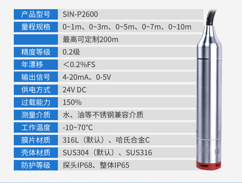 SIN-P260/P2600投入式液位變送器由高性能擴(kuò)散硅壓阻式壓力傳感器作為測量元件,把與液位深度成正比的液體靜壓力準(zhǔn)確測量出來